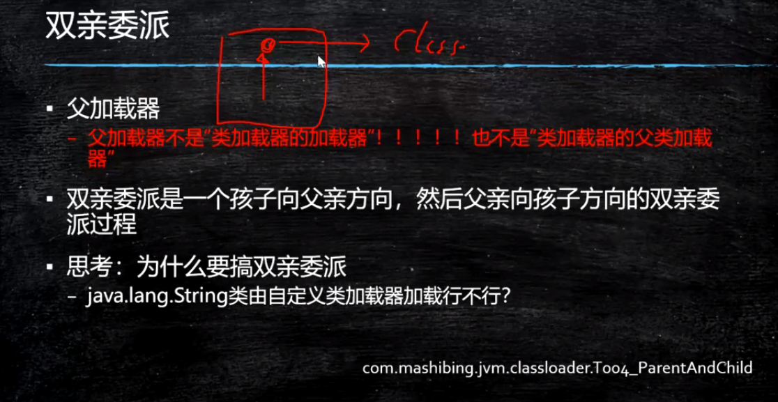 - 如果父类加载器还存在其父类加载器,则进一步向上委托,依次递归,请求最终将到达顶层的启动类加载器